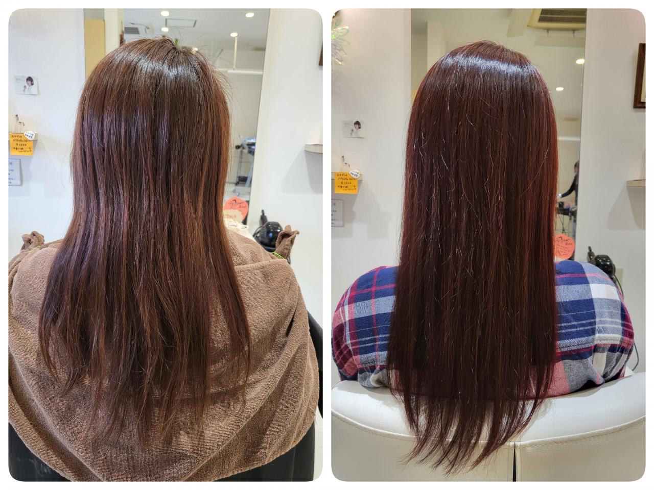 退色してブラウンになっていた姉の髪を全頭カラーで赤にしました。