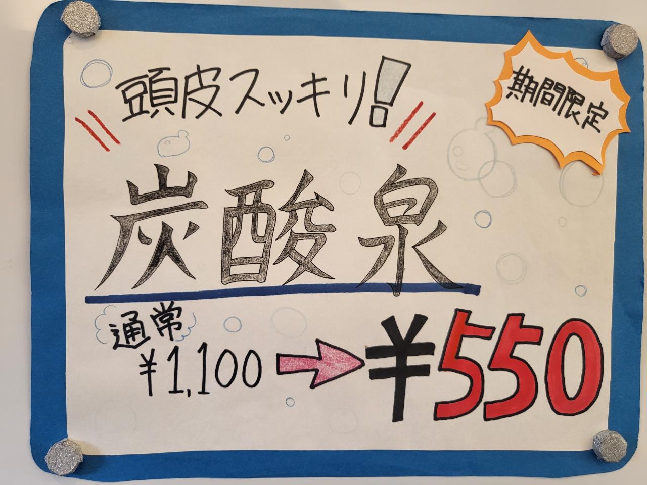 今月は¥1100の炭酸泉が半額の¥550とお得になっています!