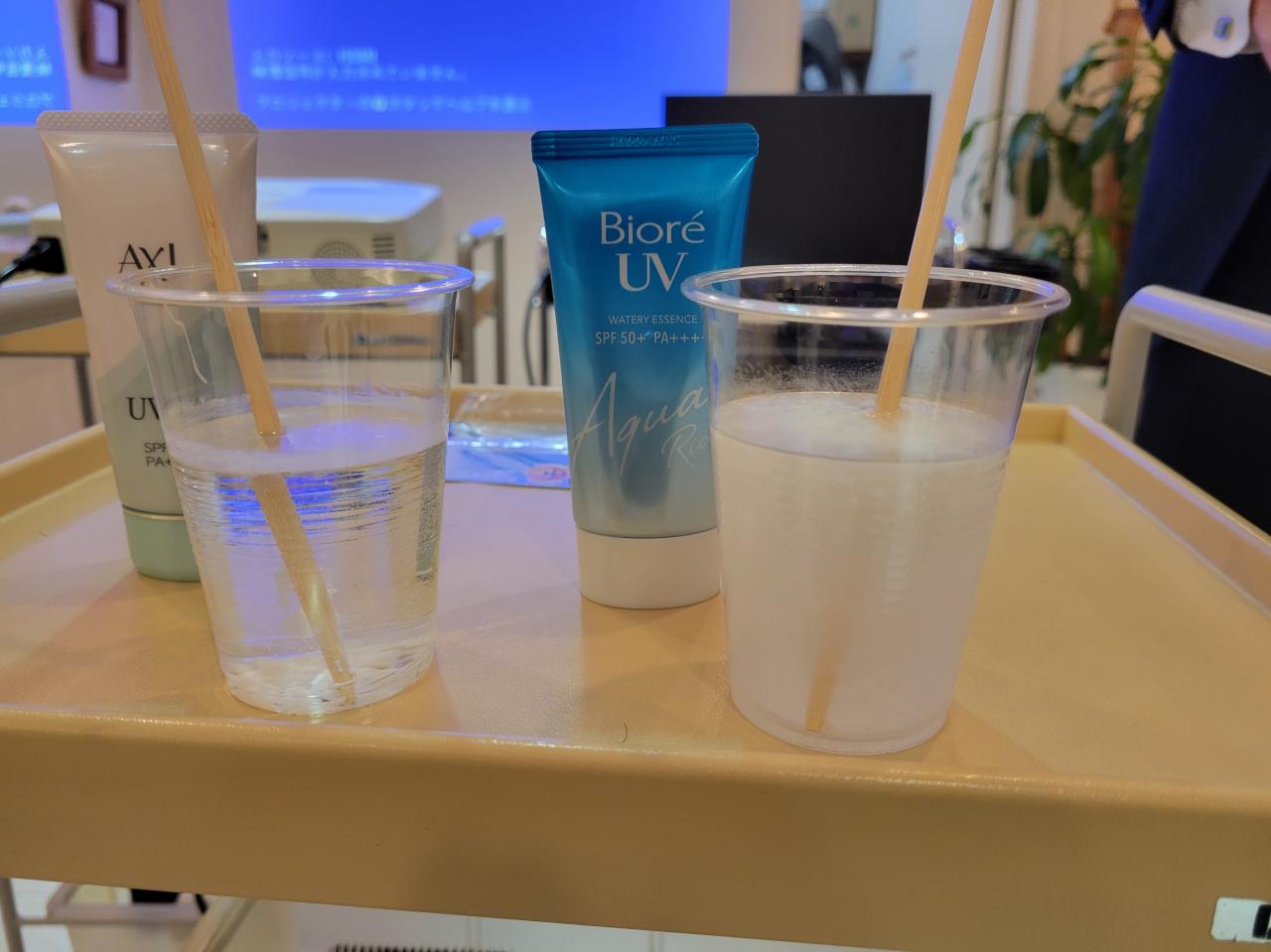 実験をしまして右側が他社の日焼け止めで左が取り扱っている日焼け止めです。