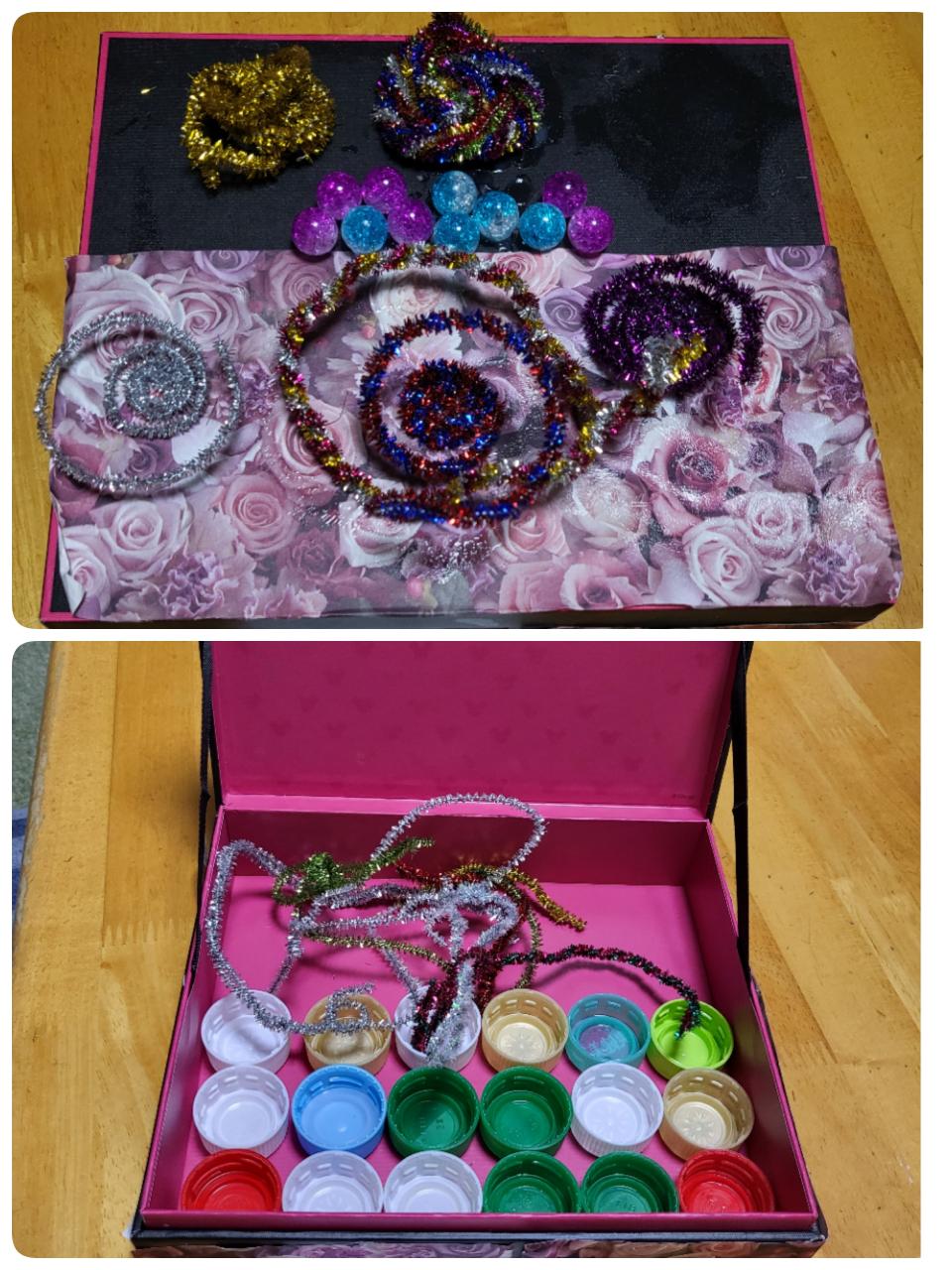 綺麗なペーパーや、ビーズ、モールなどで飾り付けて、ドングリ入れを作ってきたようです。