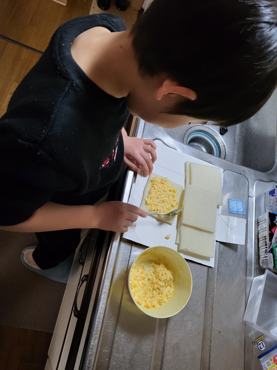 朝からお昼に食べるたまごサンドを子供が作りたいと言うので、初めて一緒に作りました!